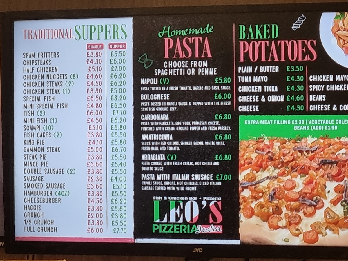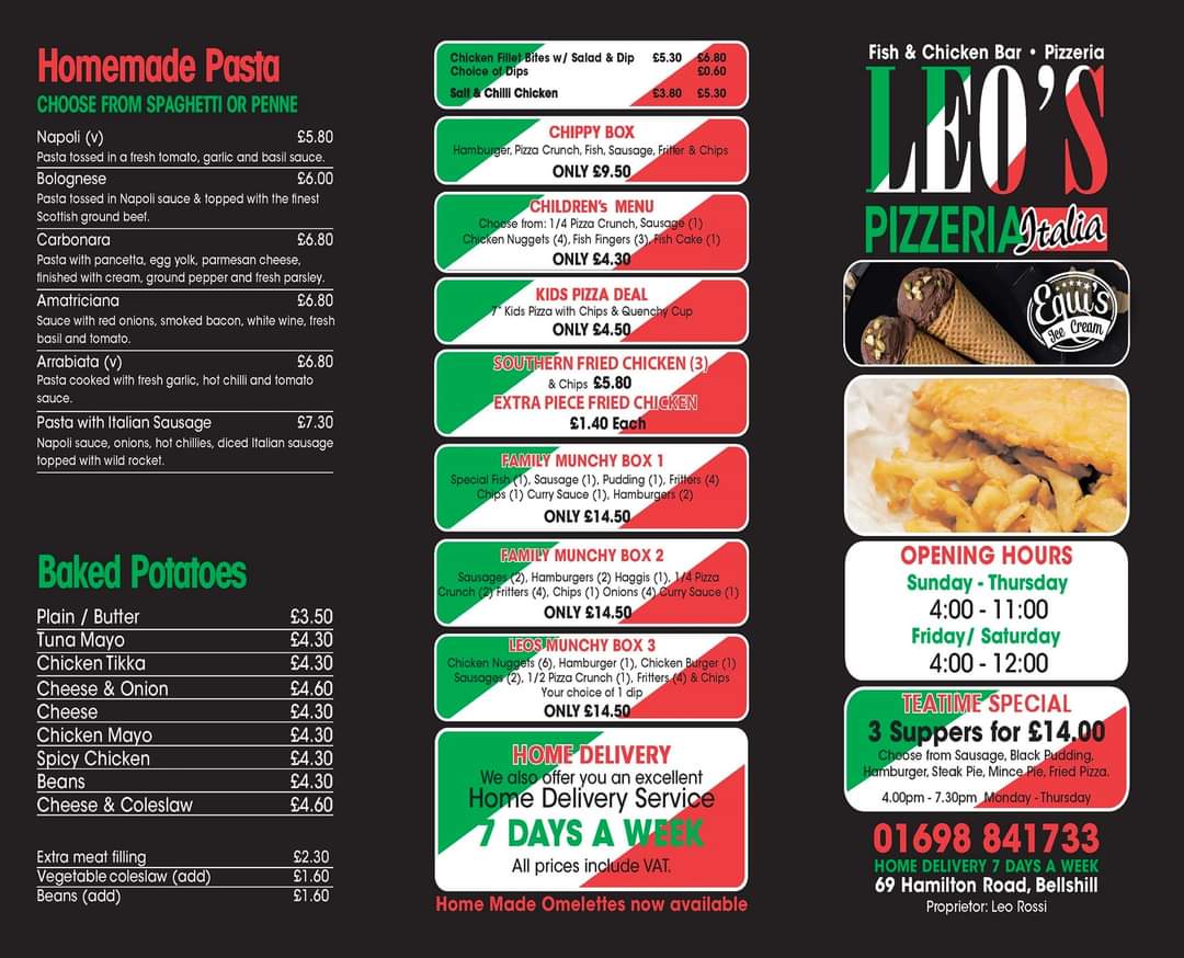 Leo's Pizzeria offers a straightforward and welcoming menu centered around classic comfort food. The atmosphere is casual and inviting, perfect for a quick takeaway or a relaxed meal at the restaurant. Whether you’re stopping by for a filling lunch or an evening treat, the menu provides a variety of familiar flavors that are easy to enjoy at any time.